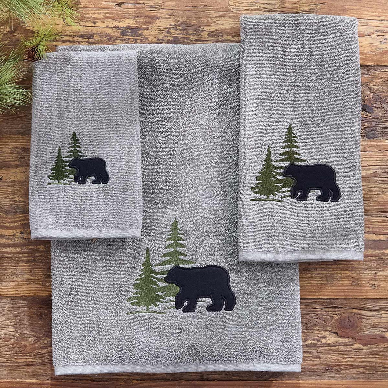 Compare Add to Cart The item has been added Bear & Pine Tree Fingertip Towel A simple bear and tree design adds inviting cabin style to your bath on this embroidered soft cotton towel. Machine wash. 11"W x 19"L View Details Please Select an option. Old Price $15.95 Sale Price: $13.95 13.95 Bear & Pine Tree Fingertip Towel, Quantity: Decrease Quantity: Increase Quantity:
